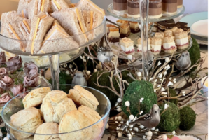 The setting sets the tone. Choose a bright, comfortable space like your dining room, sunroom, or garden if weather permits. Drape the table with a crisp linen or floral tablecloth. I used a linen tablecloth depicted with birds, twigs and leaves. To continue the theme, I set out the tiered cake stands and plates first, then decorated with green moss balls, twigs and little clip-on birds. Feel free to use your finest china—teacups, saucers, small plates, and tiered cake stands if you have them. Play gentle classical music or light jazz in the background to enhance the mood without overpowering chatter.